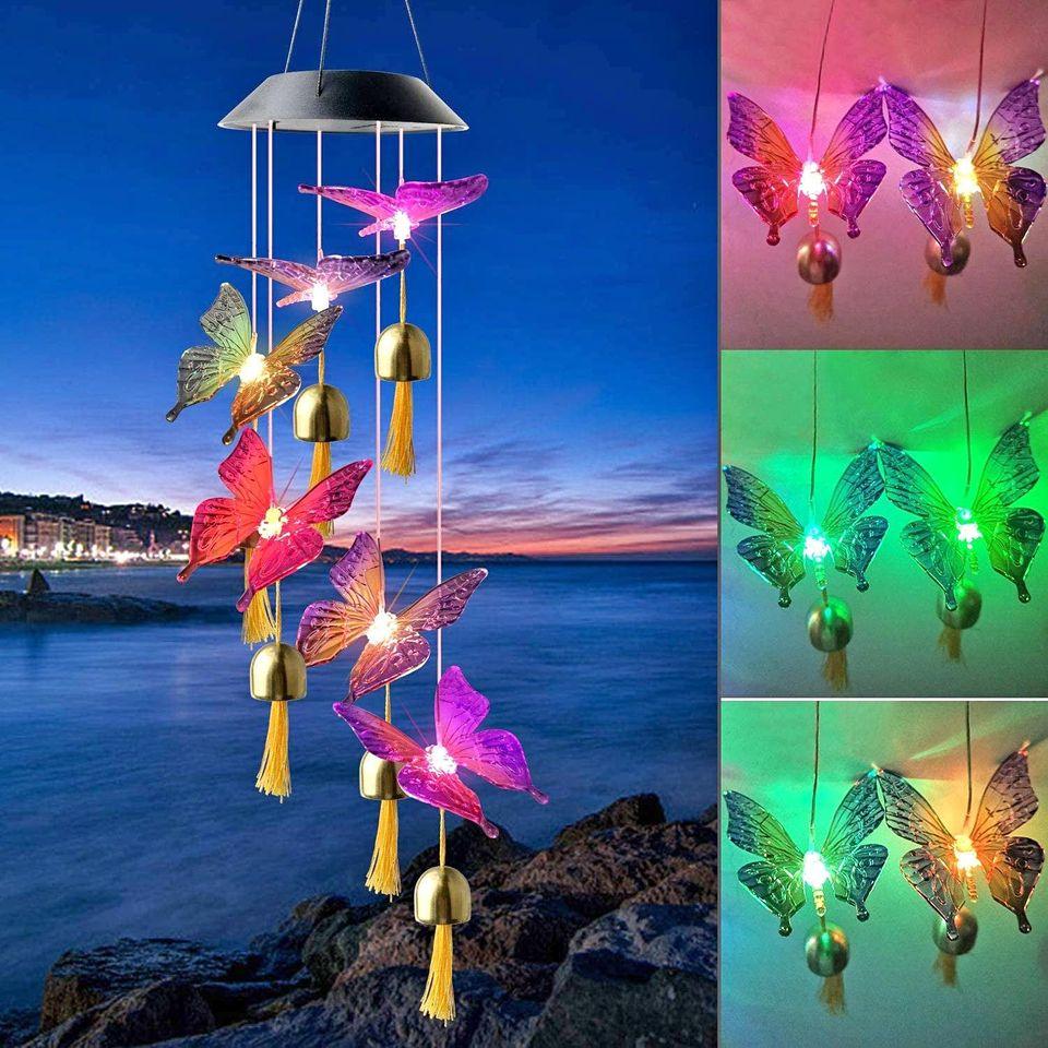 - The solar panel stores natural energy to illuminate the butterfly without electricity. Our outdoor wind chime light is waterproof and durable, great for hanging up at your garden or patio. And if you like environmental friendly product,